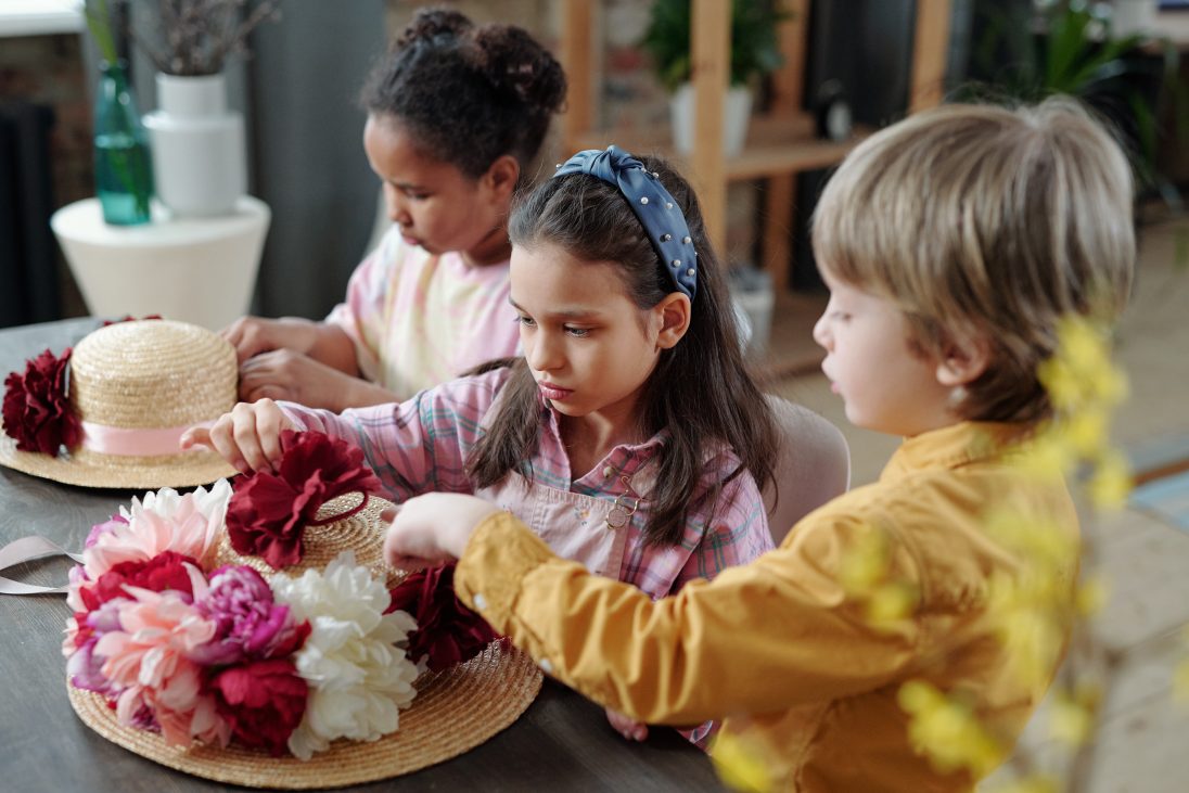 group-cute-intercultural-kids-casualwear-sitting-by-table-home-putting-handmade-flowers-white-pink-crimson-colors-hat 13 février 2026