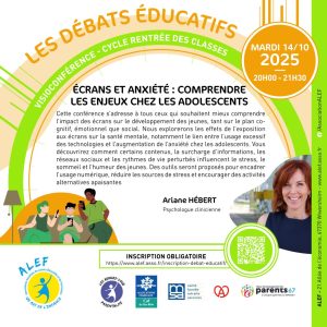 Rendez-vous en visio pour le débat éducatif du 14 octobre 7 octobre 2025 Rendez-vous en visio pour le débat éducatif Mardi 14 octobre 2025 à 20h. ARIANE HEBERT, psychologue clinicienne nous parle d’anxiété : « Ecrans et Anxiété : comprendre les enjeux chez les adolescents » Pour participer, inscrivez vous : https://www.alef.asso.fr/inscription-debat-educatif/