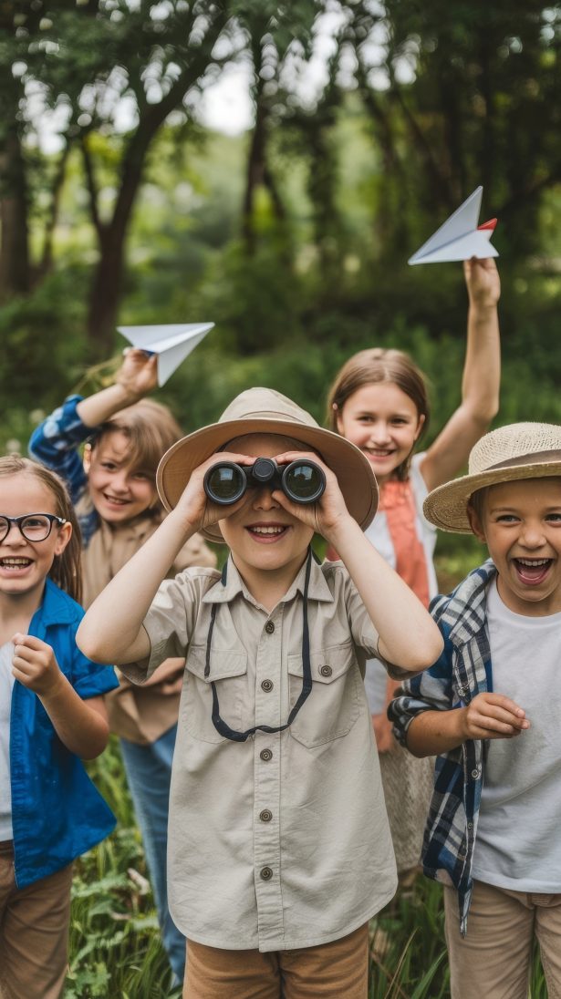 des-enfants-jouant-avec-des-jumelles-et-des-avions-en-papier-un-jour-d-ete-dans-le-parc-des-enfants-heureux-jouant-a-pret